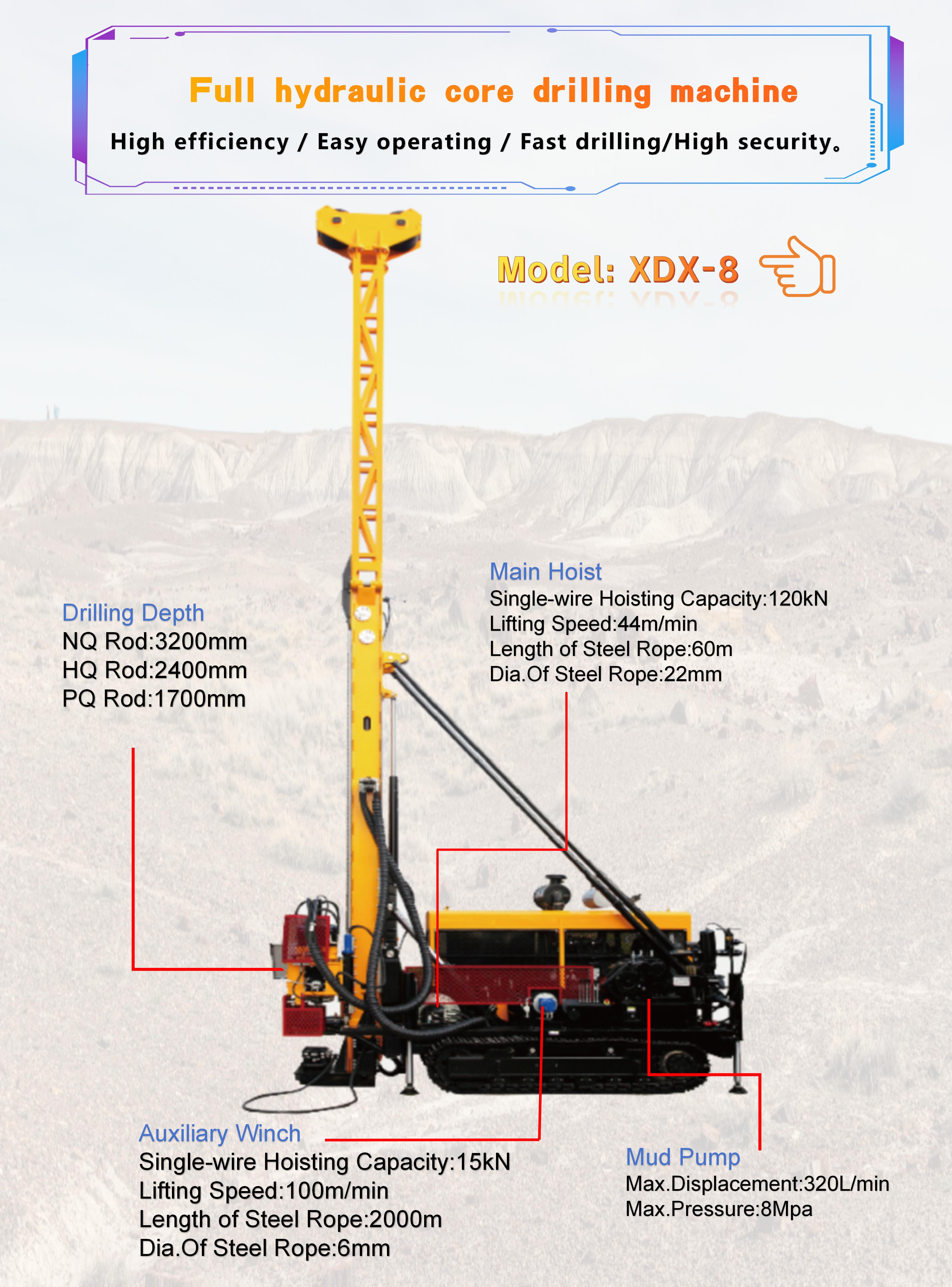 XDX-8 Hydraulic Core Drilling Rig ,is a thoroughly new-typed drilling rig developed on the basis of the advanced techniques in the world.XDX-8 is reasonable in design,compact in structure, excellent in performance, easy for operation and convenient for maintenance, thus, it is an ideal core drilling machine.